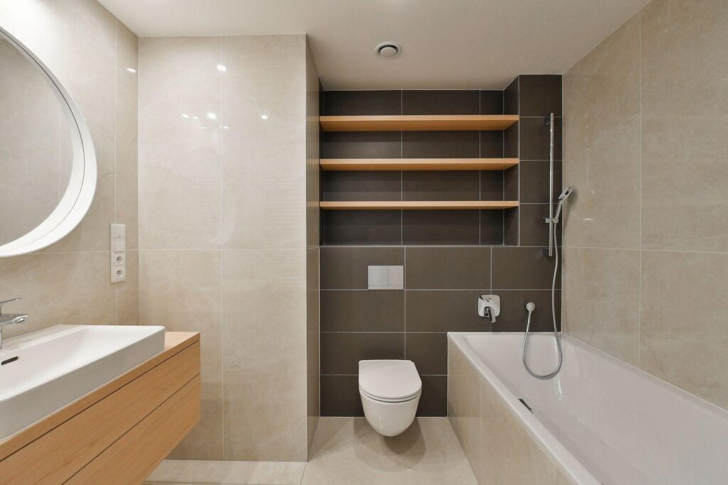 dubové podlahy, lakované dveře, velkoformátové obklady, vybavení koupelen od společností Laufen/Hansgrohe