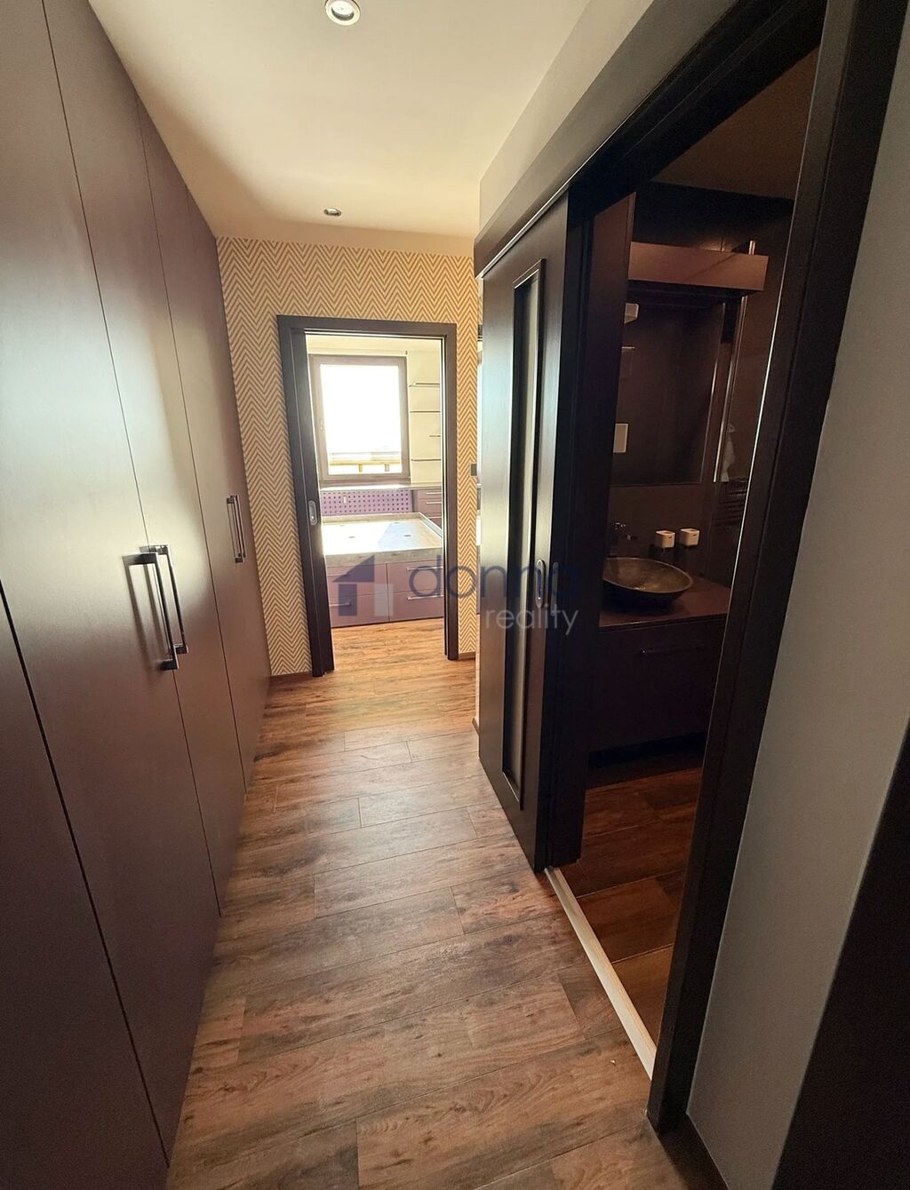 Veškerý nábytek je vestavěný a dělaný na míru od truhláře.