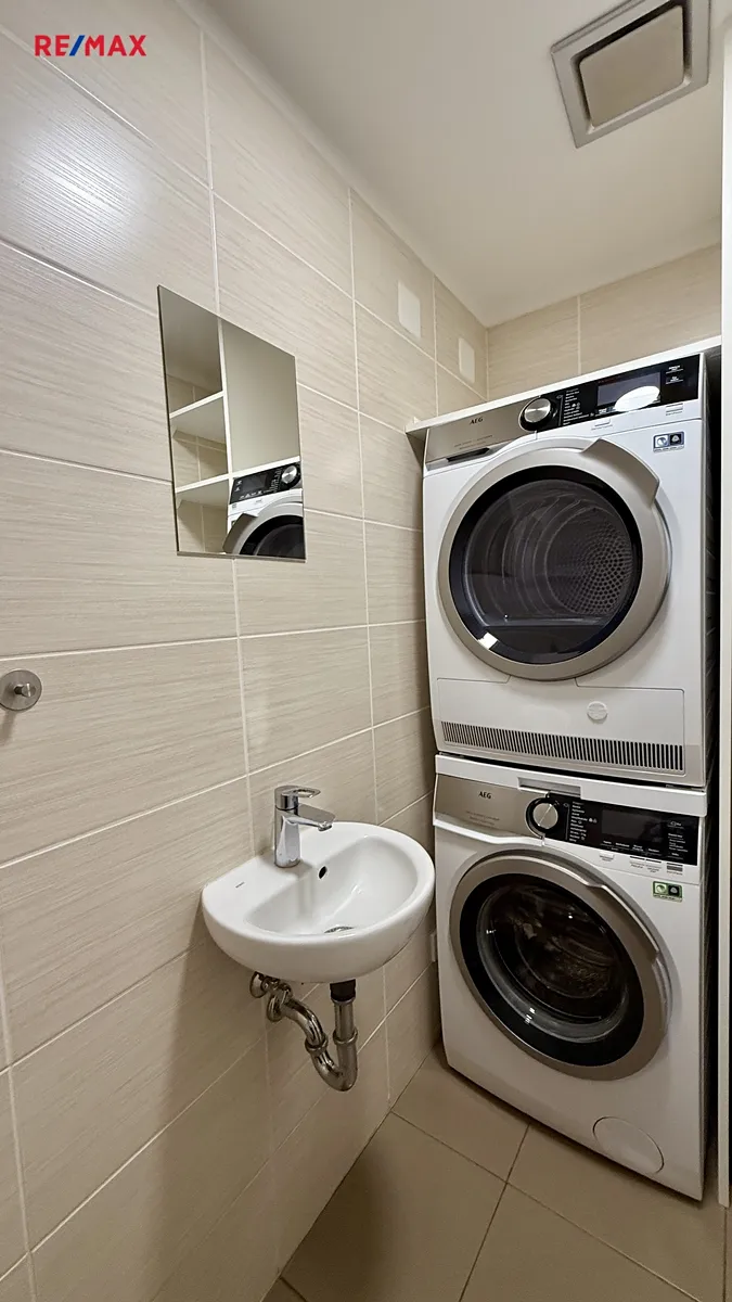 Koupelna je vybavena vanou i sprchovým koutem, nechybí ani samostatná toaleta, kde je umístěna pračka a sušička – obojí je součástí pronájmu.