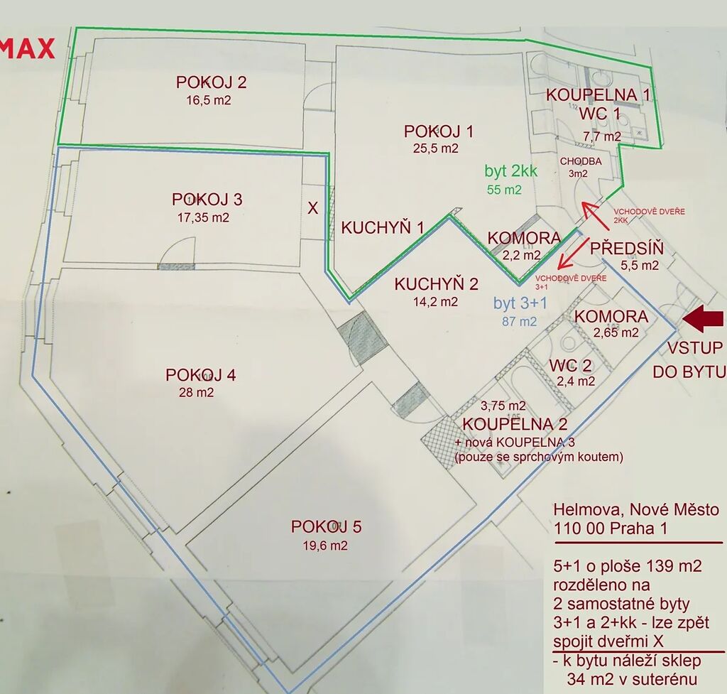 Bytová jednotka 5+1 je rozdělena dvěma vchody na byty 2kk 55 m2 a 3+1 87 m2, ale lze užívat i jako jeden velký 140m2 byt pro větší rodinu obnovením středových dveří - viz. značka X na výkresu u fotek.