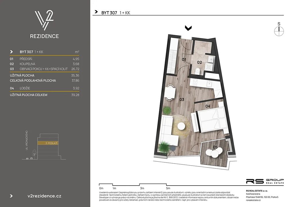 Nabízený byt o dispozici 1+kk a velikosti 37,6 m² je umístěn ve 3. patře a jeho součástí je lodžie o velikosti 3,9 m². K bytu je možné dokoupit sklepní kóji a parkovací stání (cena není zahrnuta do ceny inzerátu).