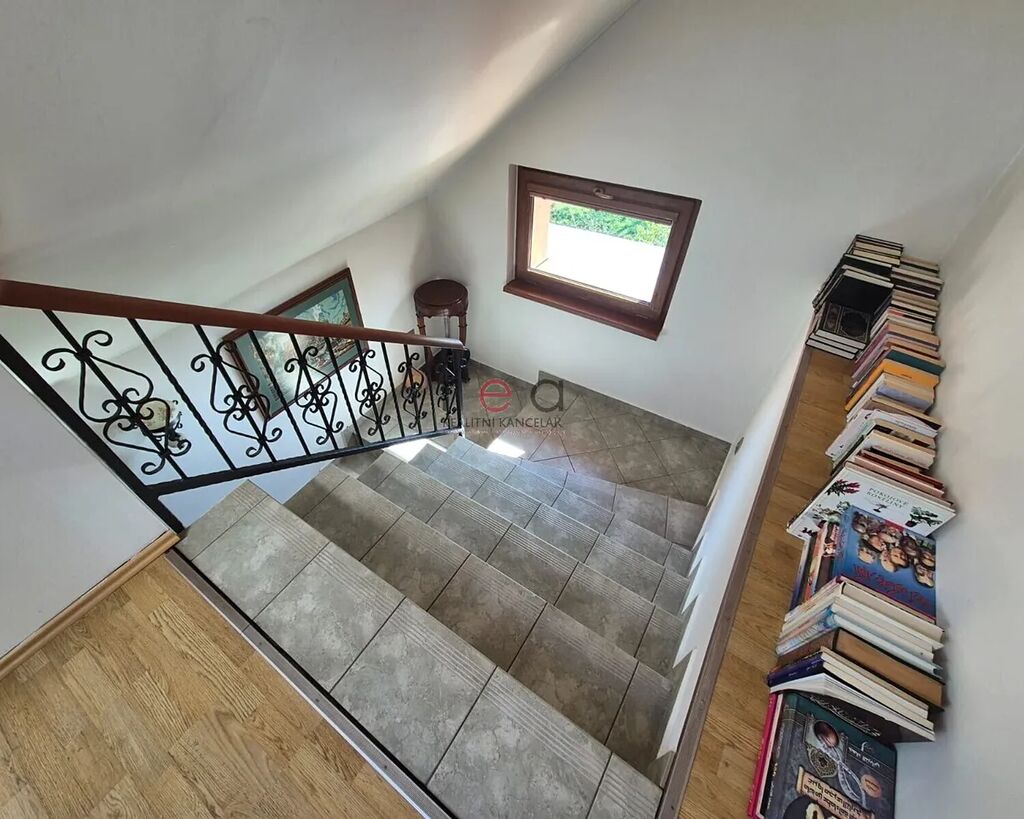 V patře je velký obývací prostor s jídelnou a kuchyní s vestavnými spotřebiči (70m2), veliká zastřešená terasa situovaná na JV, ložnice, koupelna rohovou vanou, WC, schodiště do podkroví.