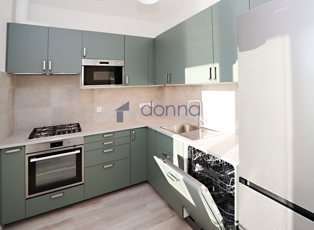 Byt nabízíme bez nábytku, k dispozici je nová kuchyňská linka včetně spotřebičů - plynový sporák, el. trouba, digestoř, lednice se samostatným mrazákem, myčka, zabudovaná mikrovlnná trouba.