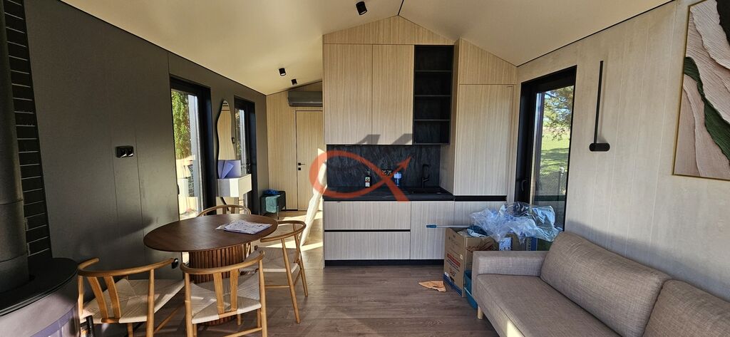 Dispozice a vybavení: otevřený obývací pokoj s kuchyňským koutem, s výstupem na terasu a zahradu. Samostatná ložnice, koupelna se sprchovým koutem a WC. Tepelný komfort zajišťuje elektrický kotel napojený na podlahové topení ovládané zvlášť v každé místnosti doplněný krbem v obývacím pokoji. Vodu ohřívá el. kotel. Voda ze studny, odpad řešený jímkou.