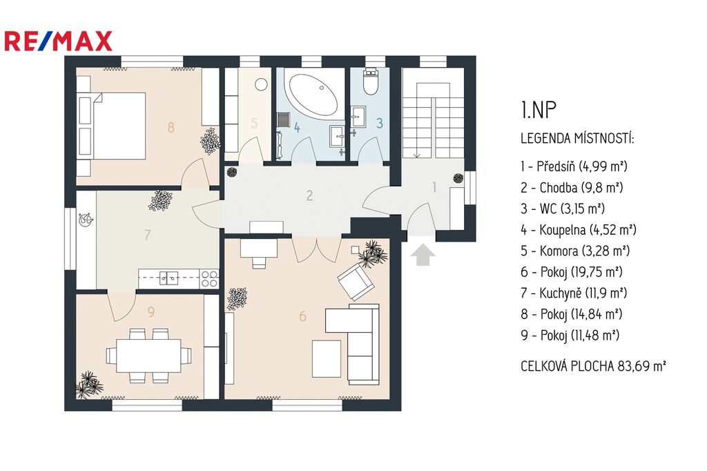 V přízemí se nachází prostorné zádveří, ze kterého vedou schody do 2. nadzemního podlaží, a dále pokračuje do obývacího pokoje, kuchyně s jídelnou, pracovny, komory, spíže, koupelny a samostatného WC. V 2. nadzemním podlaží najdete tři ložnice, prostor, který lze využít jako kancelář nebo další pokoj, koupelnu a oddělené WC.