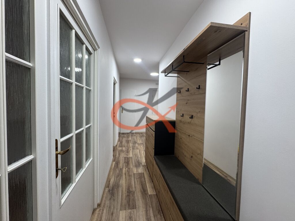 Dispozice nabízí moderní kuchyň s novou linkou a vestavnými spotřebiči – myčka nádobí, lednice s mrazákem, digestoř, varná deska, trouba a potravinová skříň. V pokojích jsou vestavné skříně a dostatek úložných prostor. Obývací pokoj je vybaven pohodlnou sedačkou a jídelním stolem. V předsíni se nachází praktická předsíňová stěna.