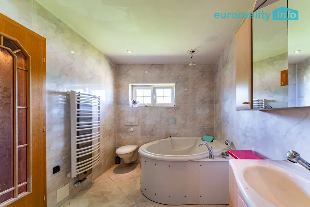 Součástí nemovitosti jsou dvě zachovalé kuchyně s vestavěnými spotřebiči a dvě koupelny vybavené hydromasážní vanou. V přízemí se nachází prostorná společenská místnost s barem, zázemím a krbem, který podtrhuje jedinečnou atmosféru domu.