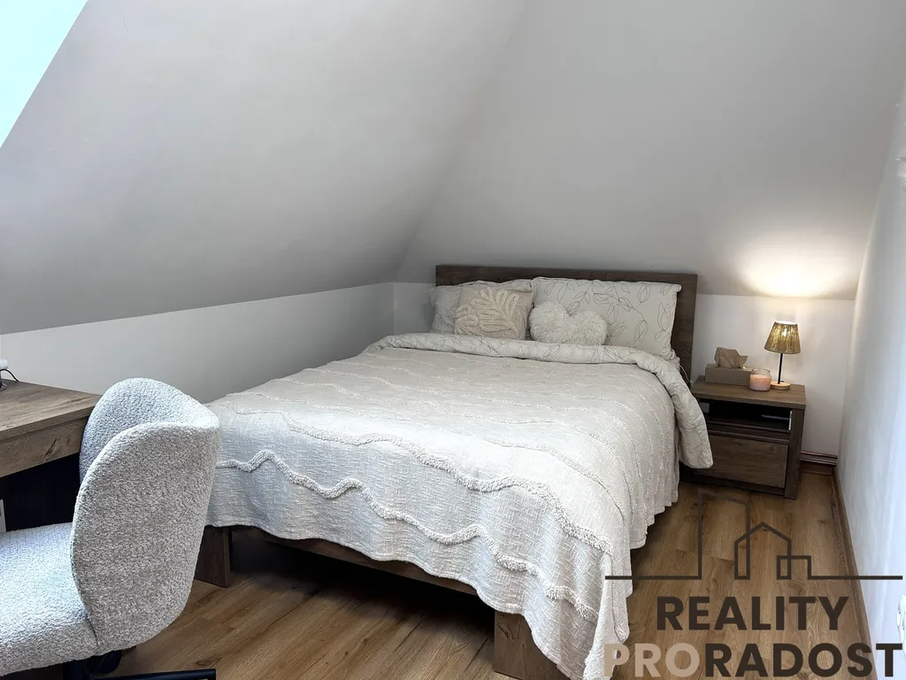 Kompletní a vkusná rekonstrukce – nové podlahy, elektroinstalace, rozvody, kuchyňská linka na míru, střešní okna, kvalitní sanita, nový plynový kotel i topný systém.