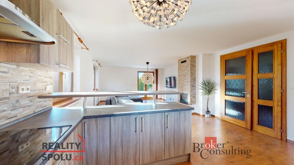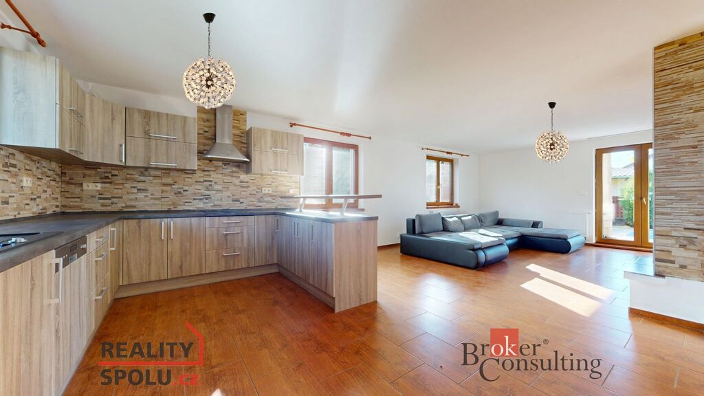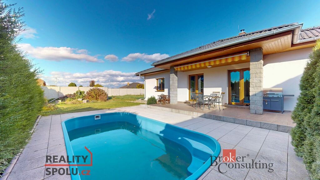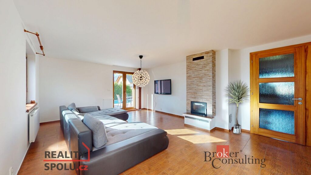 Dominantou domu je velký obývací pokoj, který je propojený s účelně zařízeným a prostorným kuchyňským koutem. Z obývacího pokoje, stejně jako z vedlejší ložnice, lze vyjít přímo ven na terasu k bazénu, či na zahradu. Další dva pokoje mohou sloužit jako dětské pokoje.