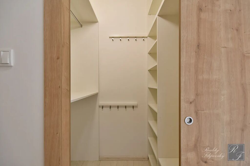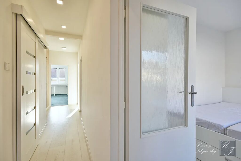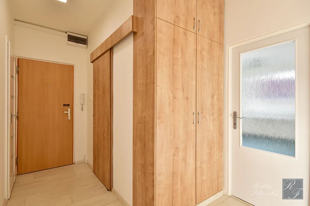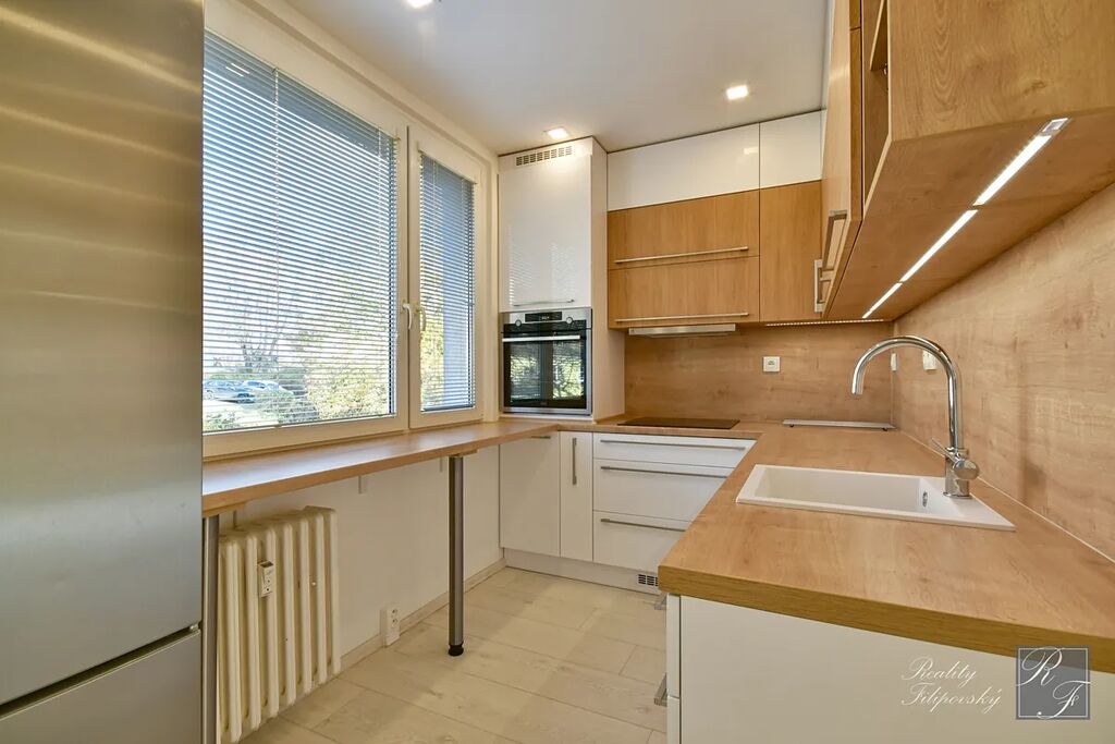 Byt prošel zdařilou rekonstrukcí. Součástí vybavení je kuchyňská linka se spotřebiči včetně myčky nádobí i lednice. Koupelna je vybavena automatickou pračkou a sušičkou a jistě oceníte úložné prostory v ložnici, pokoji a na chodbě. Velkou výhodou je také šatna oddělená posuvnými dveřmi. K bytu samozřejmě náleží sklep. Perfektní je dostatečně velká lodžie a k dispozici je i sklad v mezipatře.