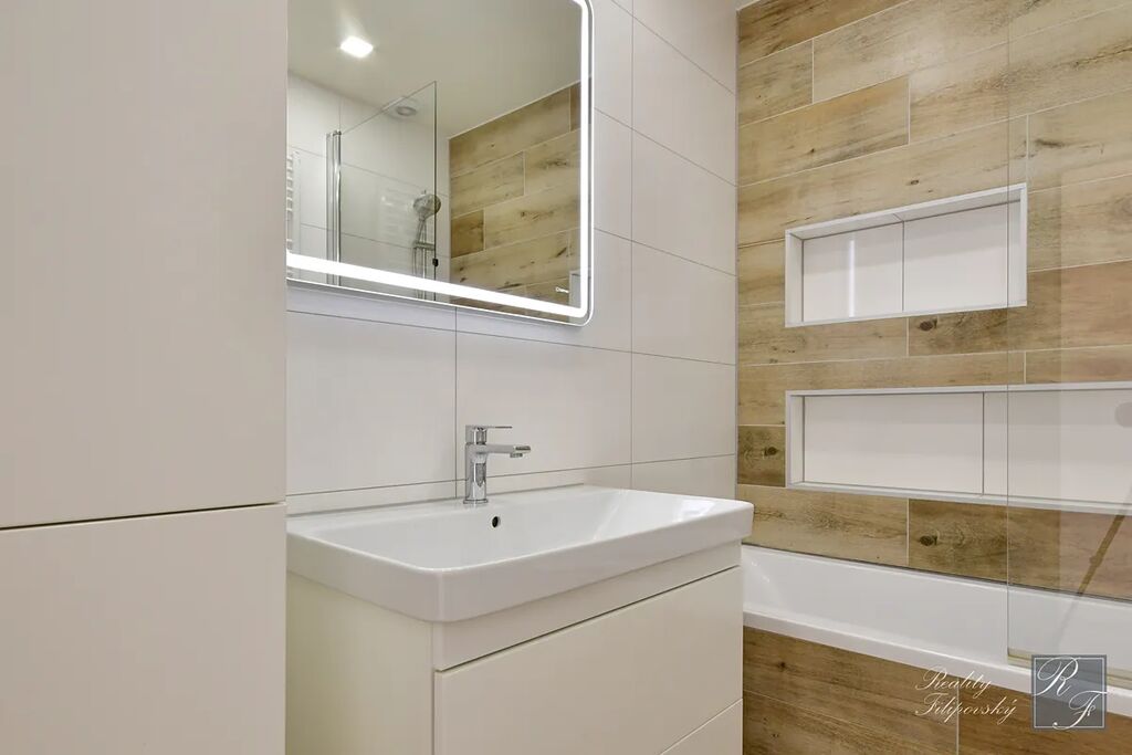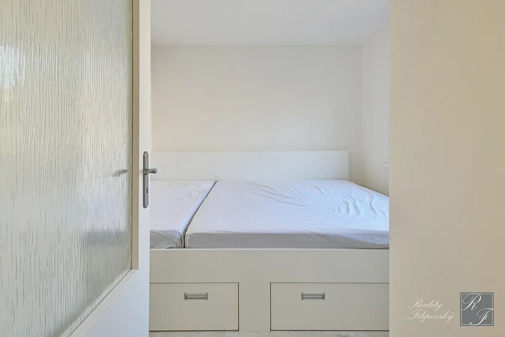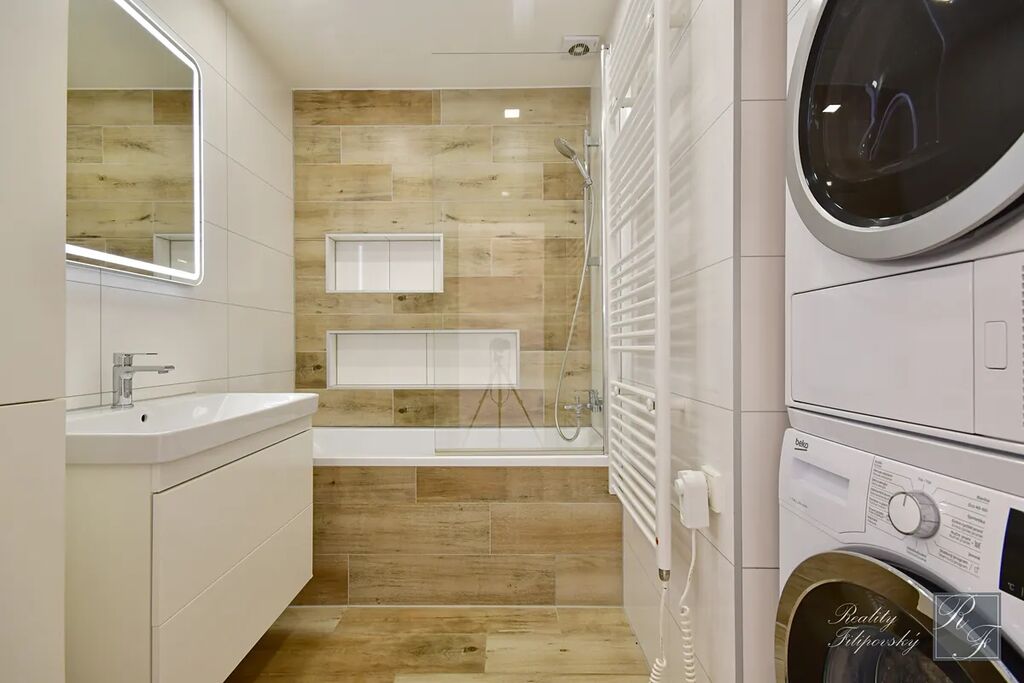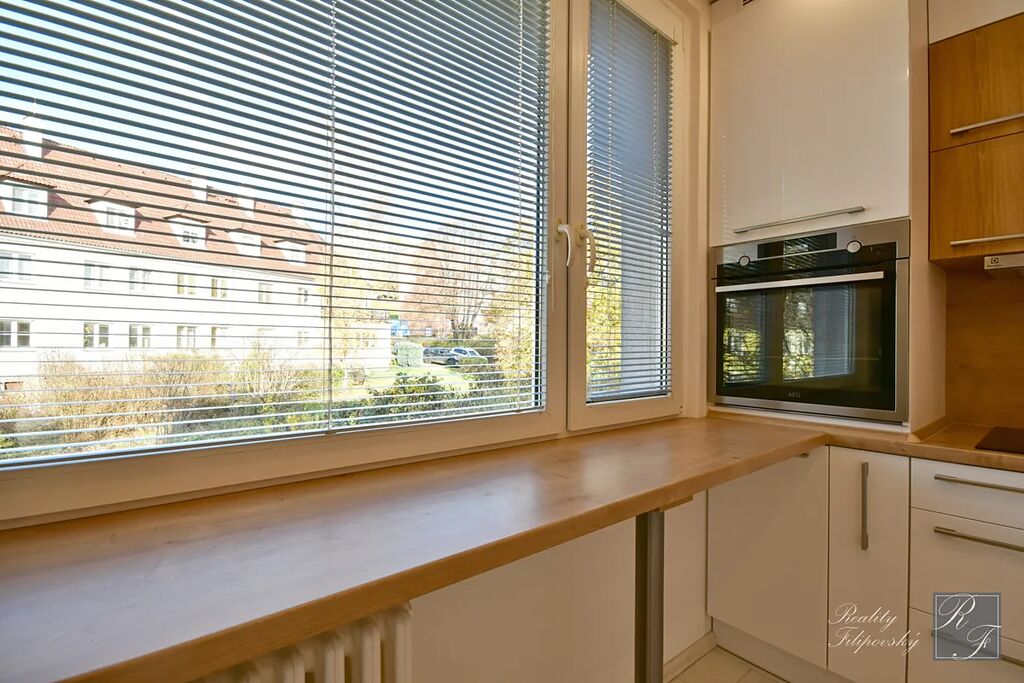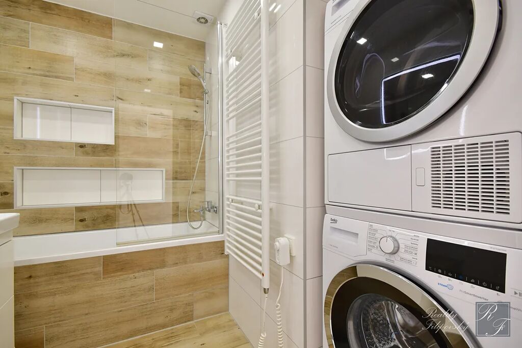 Byt prošel zdařilou rekonstrukcí. Součástí vybavení je kuchyňská linka se spotřebiči včetně myčky nádobí i lednice. Koupelna je vybavena automatickou pračkou a sušičkou a jistě oceníte úložné prostory v ložnici, pokoji a na chodbě. Velkou výhodou je také šatna oddělená posuvnými dveřmi. K bytu samozřejmě náleží sklep. Perfektní je dostatečně velká lodžie a k dispozici je i sklad v mezipatře.
