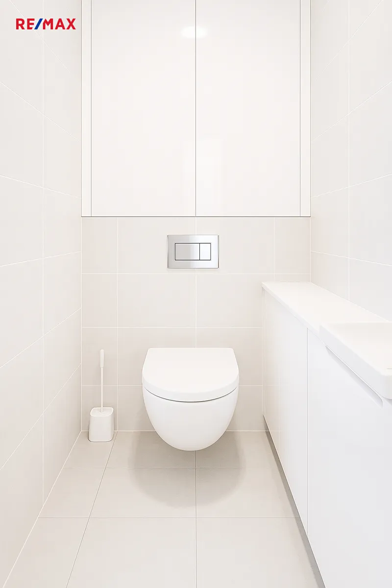 Dispozice bytu zahrnuje vstupní chodbu s vestavěnou skříní, komoru, a dvě ložnice s vestavěnými skříněmi, které zajišťují dostatek úložného prostoru. Obývací pokoj je propojen s moderně vybaveným kuchyňským koutem obsahujícím veškeré spotřebiče, včetně vinotéky a kávovaru, a tvoří tak komfortní a prostorný celek. Koupelna s oknem disponuje vanou, prostor je vyhrazen pro pračku a sušičku a z chodby je dále vstup do samostatného WC.