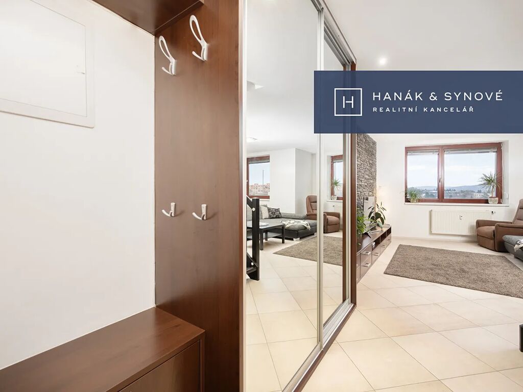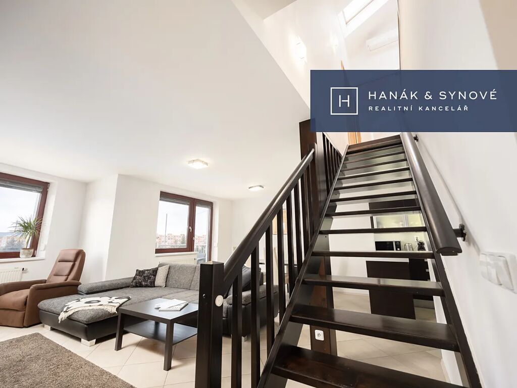 Mezonet je zařízen ve vysokém standardu a je nabízen kompletně vybavený. Byt je rozdělen na dvě patra, přičemž v 1. nadzemním podlaží se nachází vstupní chodba s vestavěnými skříněmi a prostorný obývací pokoj, ze kterého je přístup na balkon. Obývací pokoj je propojen s luxusním kuchyňským koutem vybaveným kvalitními spotřebiči (varná deska, digestoř, trouba, mikrovlnná trouba, myčka a vestavěná lednice s mrazákem). V tomto podlaží se rovněž nachází první ze dvou koupelen, která je vybavena pračkou a sušičkou.