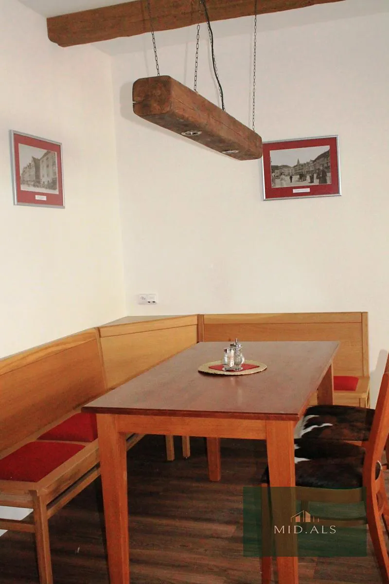 Obývací pokoj s kuchyňským koutem : sedací souprava - rozkládací dvousedačka, křeslo, konferenční stolek, jídelní stůl se židlemi a rohovou lavicí, TV. závěsy, záclony, lednička, mikrovlnná trouba, indukční varná deska, pračka. Opravdu se nájemník může ihned nastěhovat.