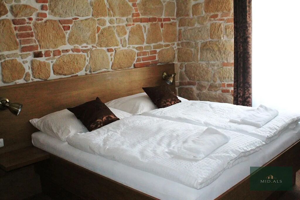 Ložnice : dvoulůžko s nočními stolky, šatní skříň, stolek se židlí, TV, závěsy, záclony.