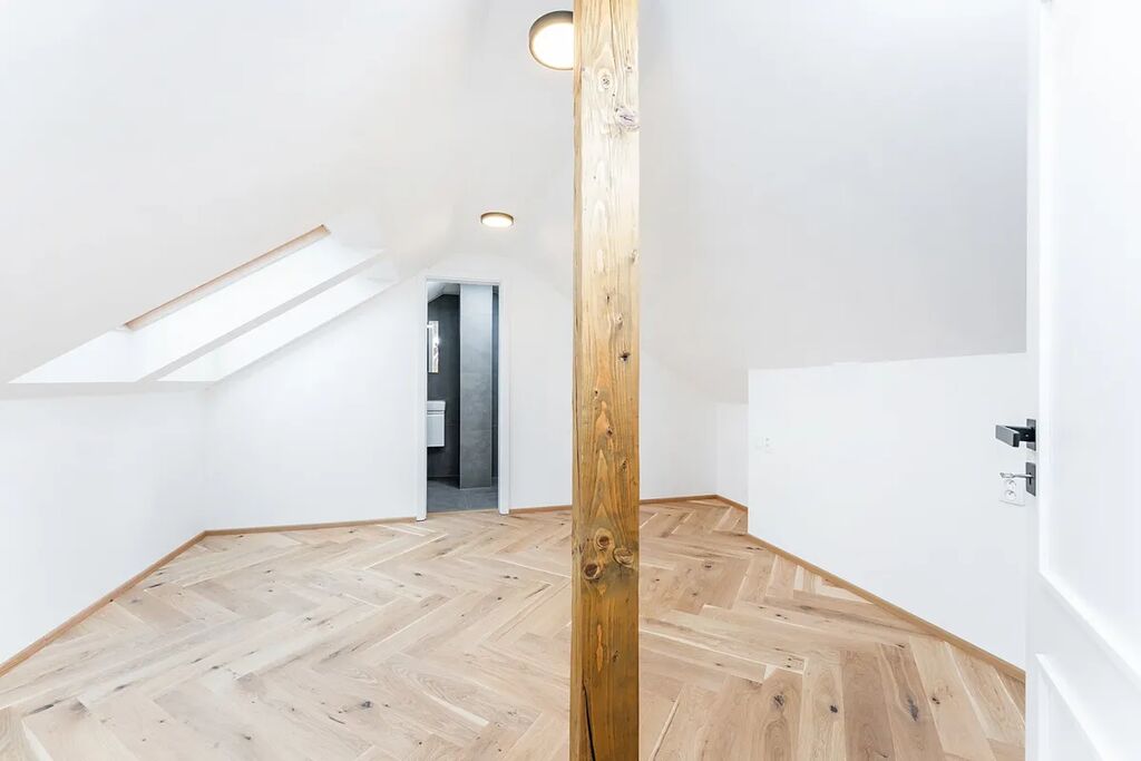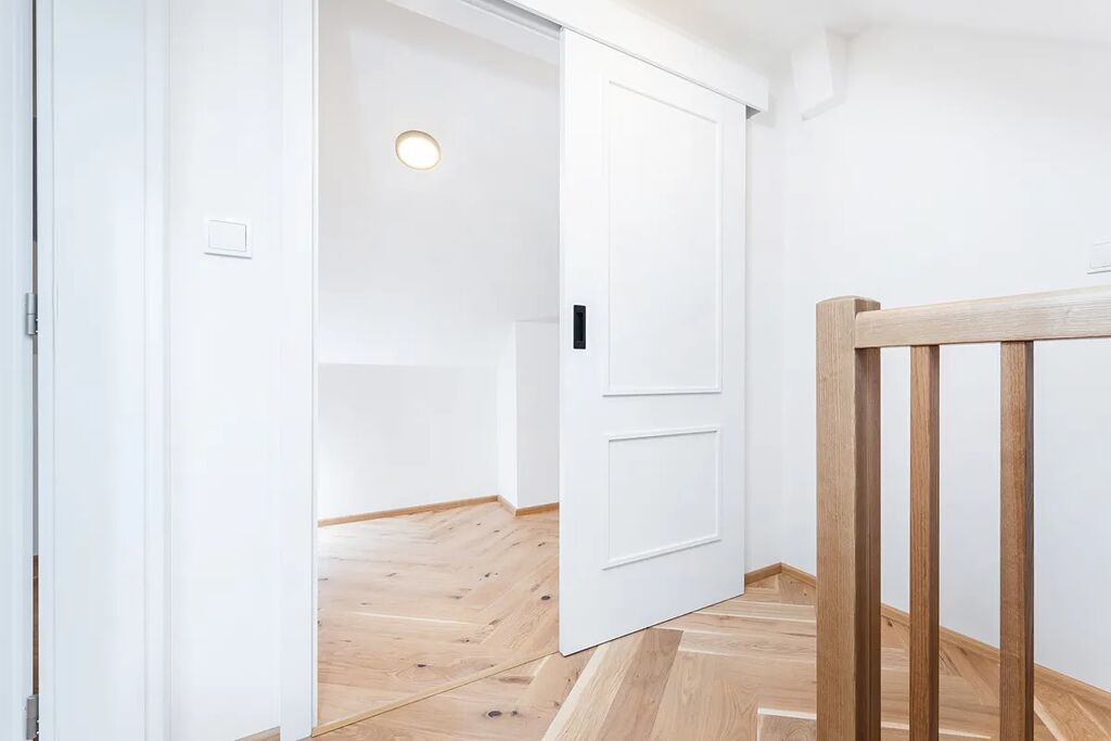 Vstupní úroveň bytu hala, obývací pokoj s kuchyňským koutem, koupelna se sprchovým koutem a dvě ložnice. V horní části se nachází průchozí pokoj vhodný jako pracovna oddělená šatna a ložnice s vlastní koupelnou a vanou.