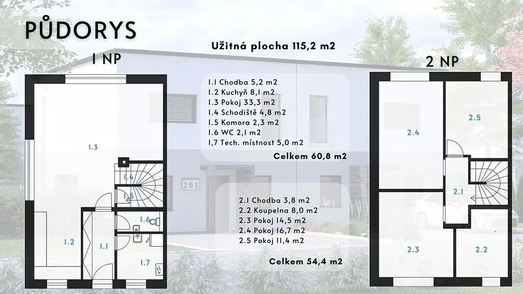 V druhém patře pak budete mít 3 pokoje a koupelnu s vanou, sprchovým koutem a wc. Hlavní ložnice má 16,7 m2, ostatní pokoje 14,5 m2 a 11,4 m2.