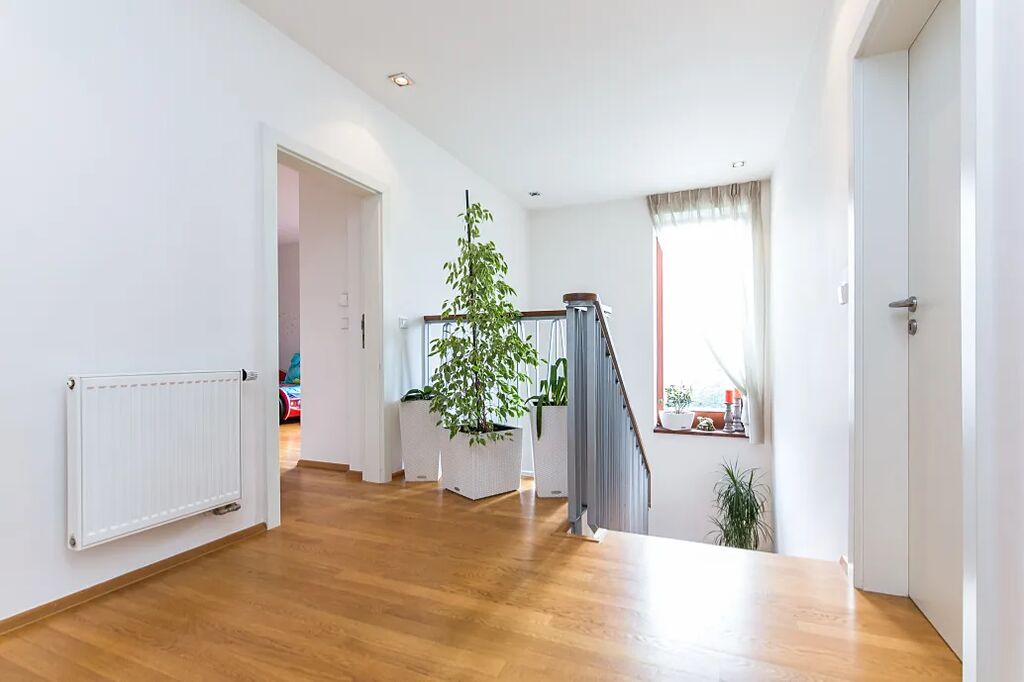 V patře se nacházejí tři ložnice a samostatná prostorná koupelna. Hlavní ložnice má navíc vlastní koupelnu se sprchovým koutem a toaletou. Ze dvou ložnic je přístup na balkon s výhledem do zahrady.