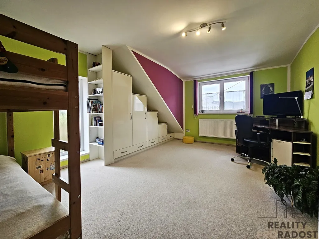 V případě potřeby je možné ve vrchním patře vybudovat z prostorné chodby s posezením další ložnici.