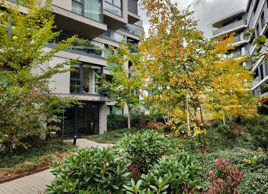 Soukromý vnitroblok je parkově upraven a pod uzavřením jen pro obyvatele.