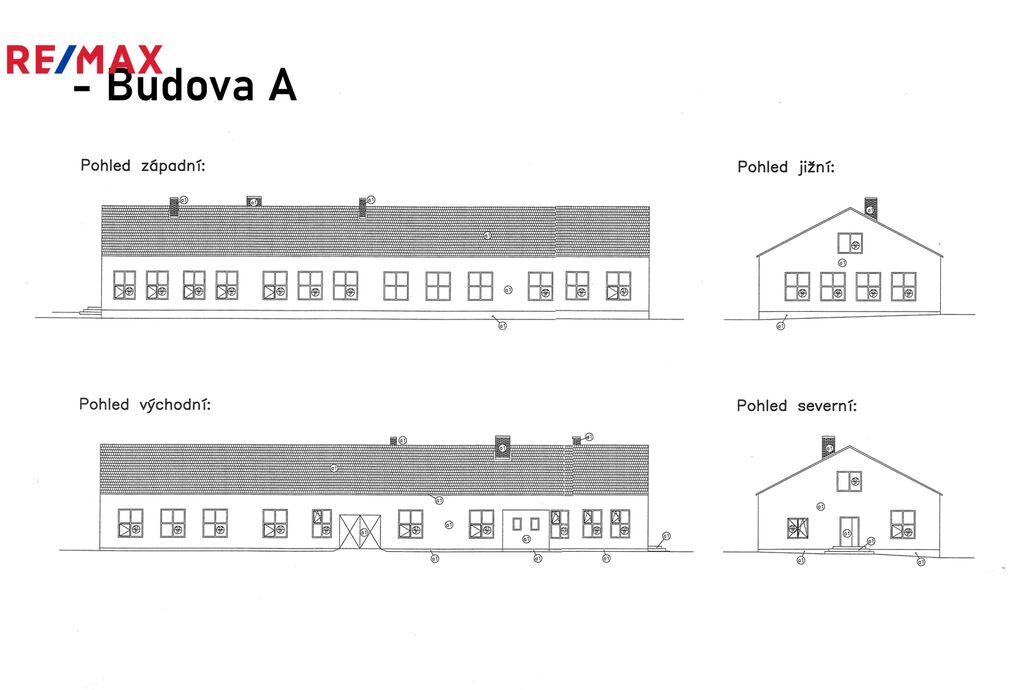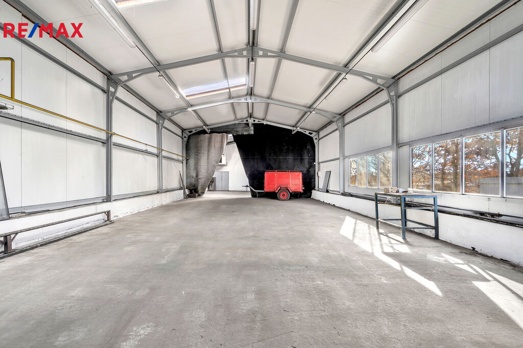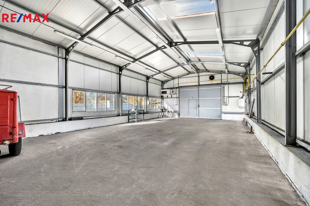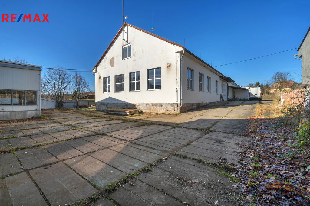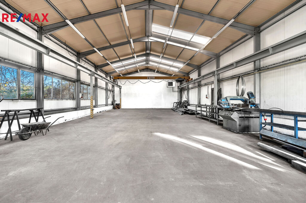 Jedná se o zděný udržovaný dvoupodlažní komplex hlavní budovy 894m2 (částečně podsklepeno cca 30m2), kde budova nabídne dvě kanceláře, zázemí pro zaměstnance – šatny, wc, umývárny a denní místnost, dále již navazují tři dílny/sklady o velikosti cca 310m2. Podlahy jsou betonové a připravené i na manipulaci s vysokozdvižným vozíkem. Hlavní vjezdová vrata o velikosti 3x2,5m. Možno rozšířit skladování lehčích materiálů v 2. nadzemním patře (půdním prostoru) o velikosti cca 400m2.