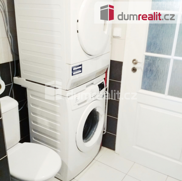 V koupelně je pračka a sušička, v obývacím pokoji pohodlná rozkládací sedačka, TV, komoda a police.