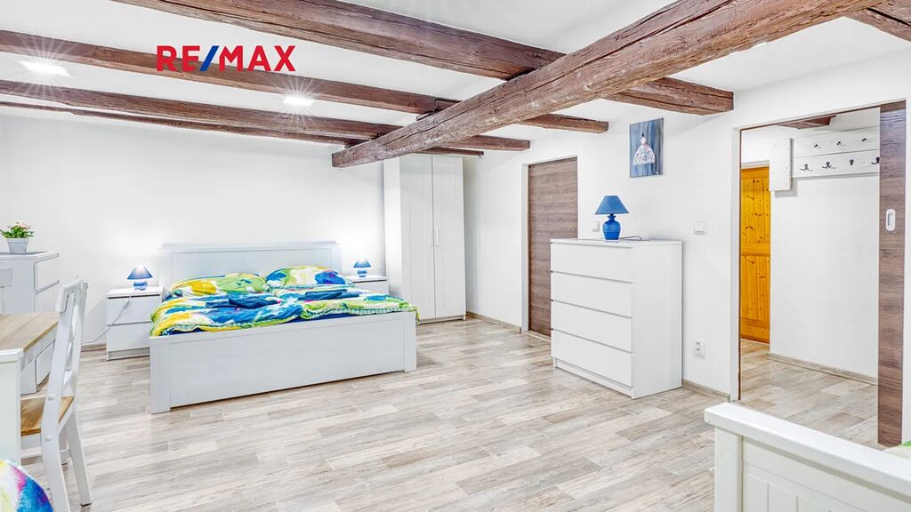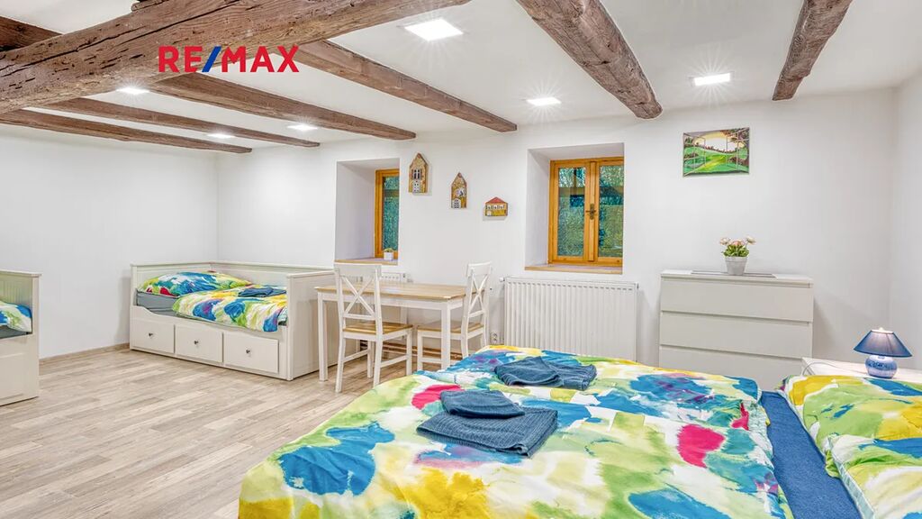 Dnes tu najdete 11 obytných místností, které dávají prostoru neskutečnou variabilitu. Část domu slouží jako útulné rodinné bydlení, druhá část už několik let vítá hosty jako malý rodinný penzion s kapacitou až 10 osob. Ať už chcete pokračovat v dobře fungujícím provozu, nebo si celý dům přetvořit pro vlastní rodinu, dům je připravený na obojí.