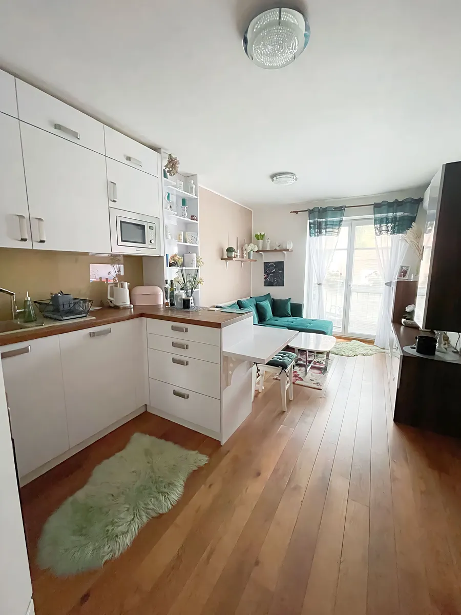 Byt je vybaven ve vysokém standardu – kvalitní dřevěné podlahy, krásné interiérové dveře, moderní kuchyňská linka s velkým úložným prostorem, vestavěné skříně a nábytek na míru. Komfort zajišťuje klimatizace v obou pokojích.