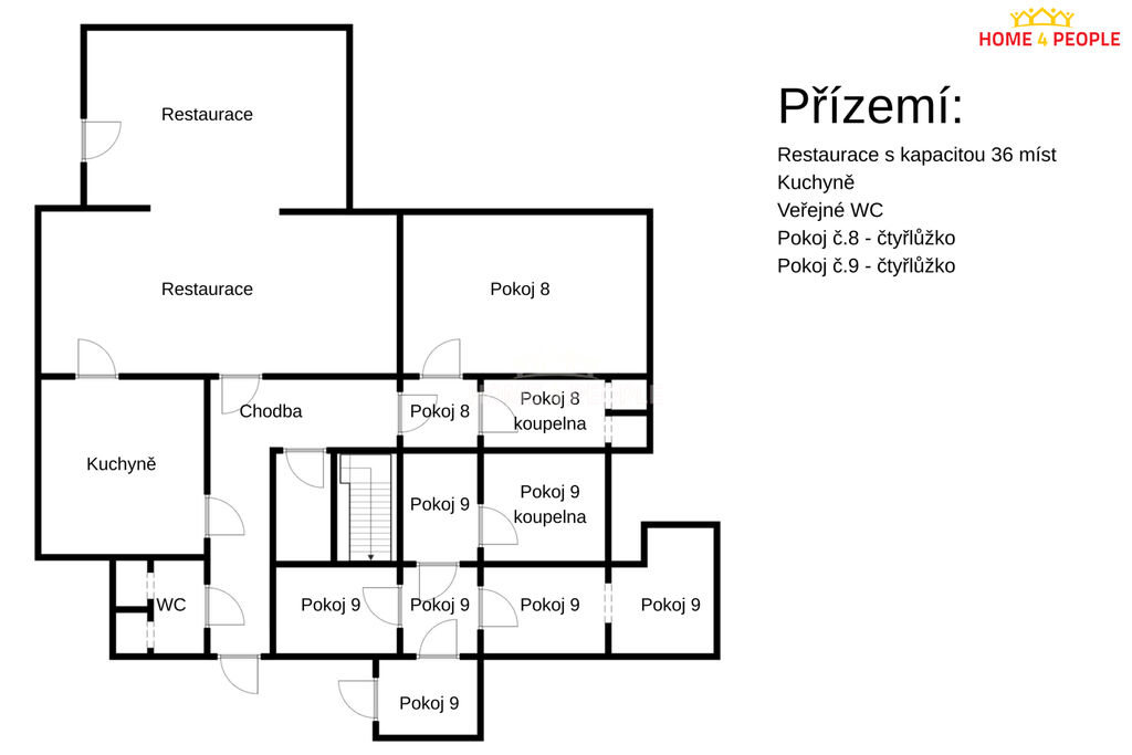 • Přízemí: 2× čtyřlůžkový pokoj