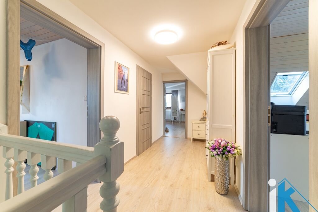 V patře se nacházejí čtyři samostatné pokoje, z nichž jeden má vlastní šatnu. Druhá prostorná koupelna je vybavena volně stojící vanou, sprchovým koutem a toaletou.