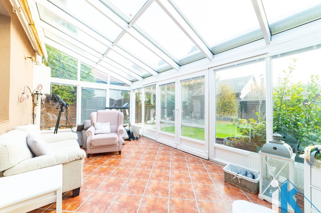 V přízemí se nachází vstupní chodba, obývací pokoj, kuchyně vč. vestavěných el. spotřebičů, koupelna, šatna, samostatná toaleta a zimní zahrada s podlahovým topením.