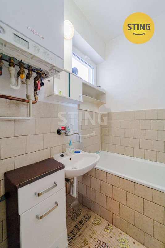V koupelně je novější plynový kotel, který vytápí celý byt a zároveň ohřívá teplou vodu.