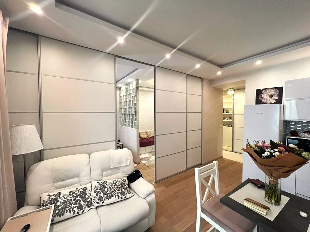 Na první pohled zaujme nápadité řešení interiéru, stejně jako jeho stylové provedení. Byt, jehož původní dispozice byla 1+kk, prošel velmi povedenou proměnou, kdy po zatažení posuvných panelů vzniká 2+kk nabízející obývací pokoj s kuchyňskou linkou a ložnici, kde díky vytvoření příčky z dnes již ikonických luxferů vznikl i prostor pro pracovnu s rozkládacím lůžkem. Dostatek úložného prostoru zajišťují mimo jiné vestavěné skříně v předsíni bytu, zde je umístěna i pračka. Koupelna je se sprchovým koutem a závěsným wc. Z obývací části i z ložnice lze po otevření francouzských oken vstoupit na terasu/zahrádku. Ta sice nenabízí dechberoucí výhledy, co ale i díky zastřešení terasové části nabízí, je pocit soukromý vybízející ke klidnému posezení.