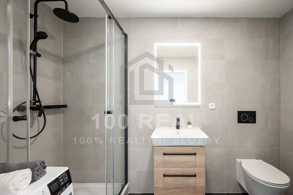 - koupelna se sprchovým koutem, umyvadlem, umyvadlovou skříňkou, topným žebříkem, světelným zrcadlem a pračkou se sušičkou + WC