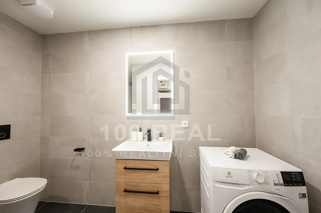 - koupelna se sprchovým koutem, umyvadlem, umyvadlovou skříňkou, topným žebříkem, světelným zrcadlem a pračkou se sušičkou + WC