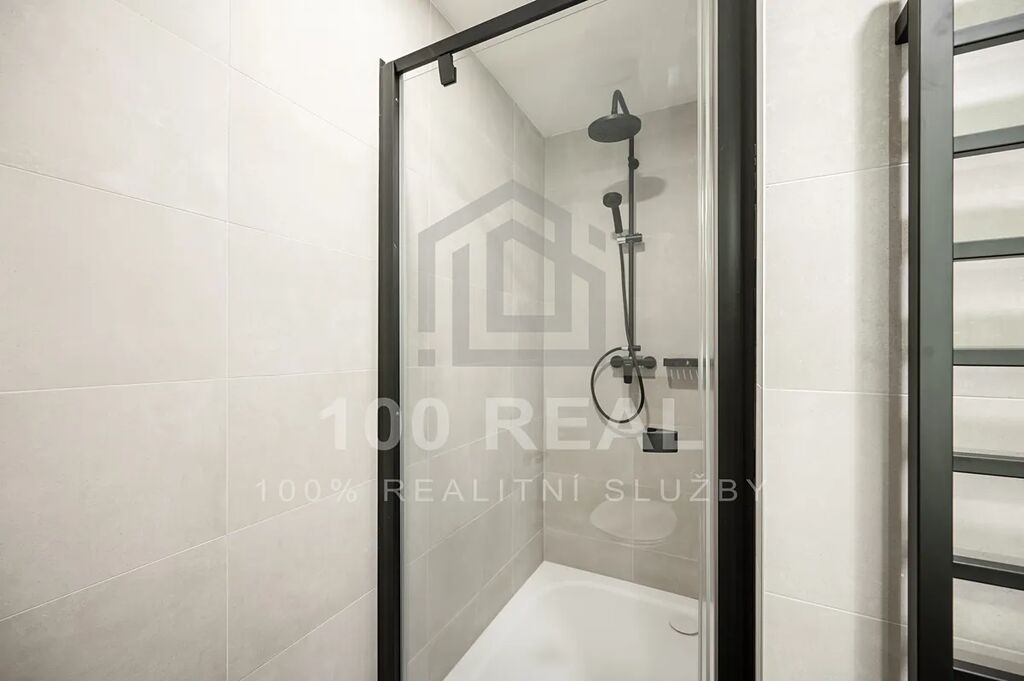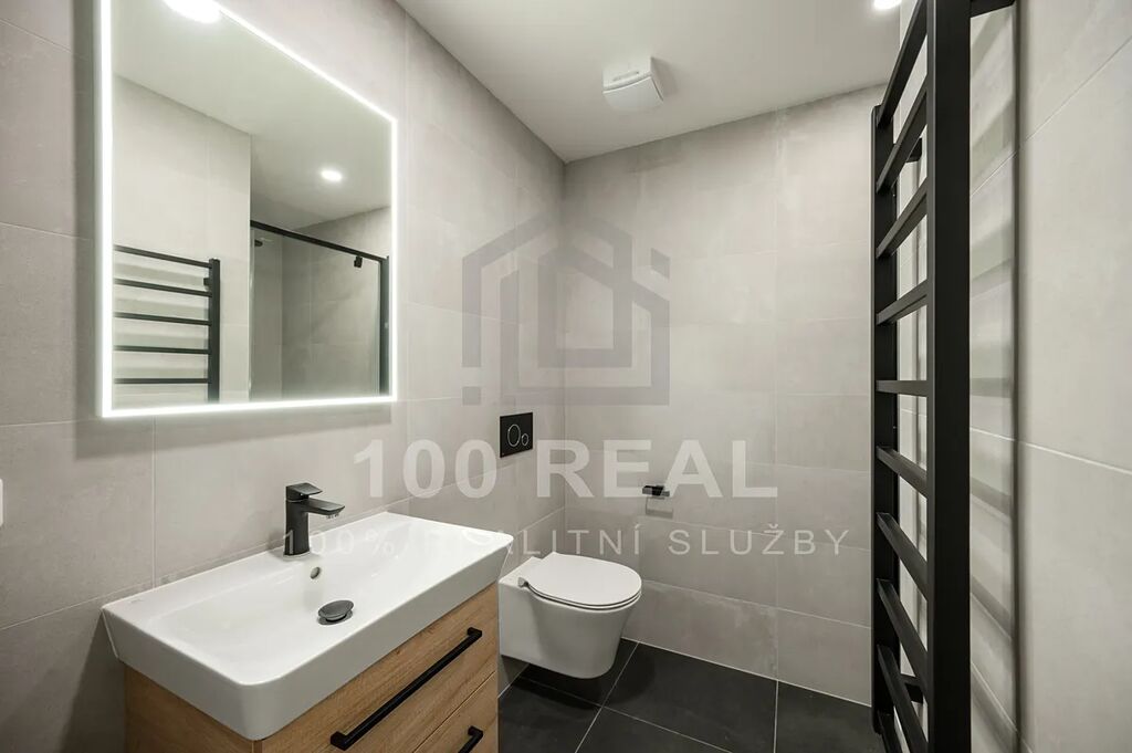 - koupelna se sprchovým koutem, umyvadlem, umyvadlovou skříňkou, topným žebříkem, světelným zrcadlem a pračkou se sušičkou + WC