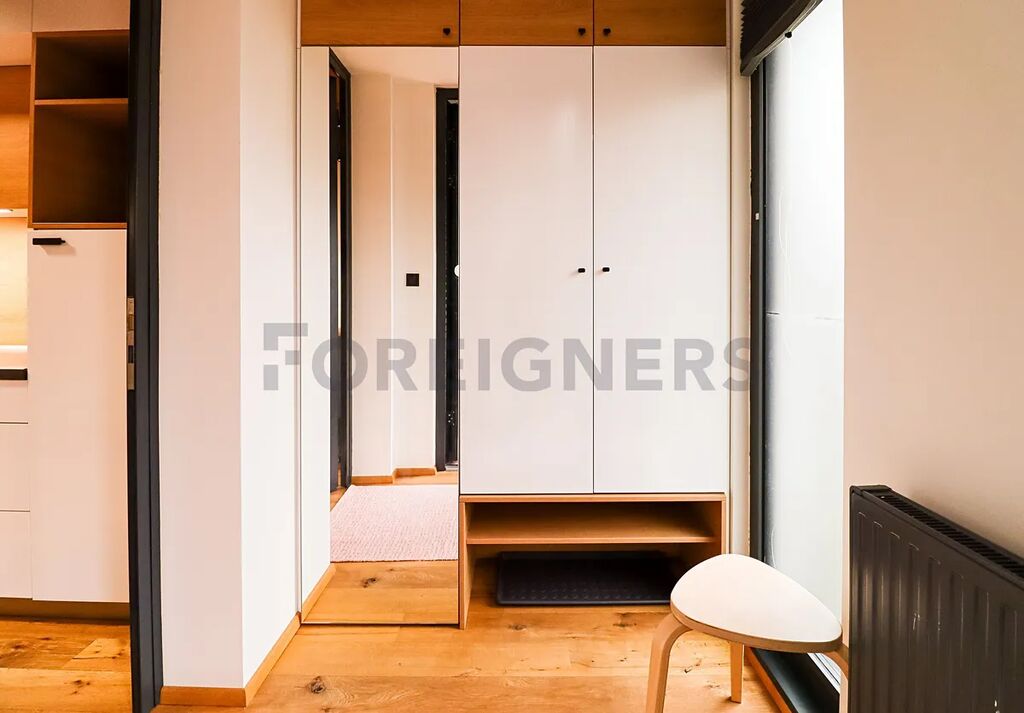 Byt je prakticky řešený – hlavní obytná místnost je opticky rozdělena na pracovní a relaxační zónu.Z pokoje je přímý vstup na soukromou terasu s posezením a výhledem do zeleně.