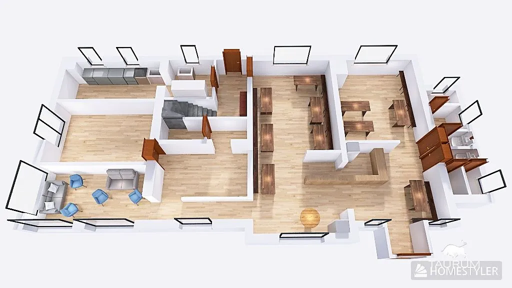 V přízemí je restaurace, výčep, hlavní sál, dva salónky, WC, nově přistavěná kuchyně a částečně i prostor pro výrobu a prezentaci piva.