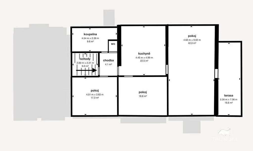 V patře jsou další místnosti, které je možné využívat po provedení rekonstrukce jako obytný prostor o dispozici 3+1 s koupelnou a WC. V současné době je užívaný jako sklad.