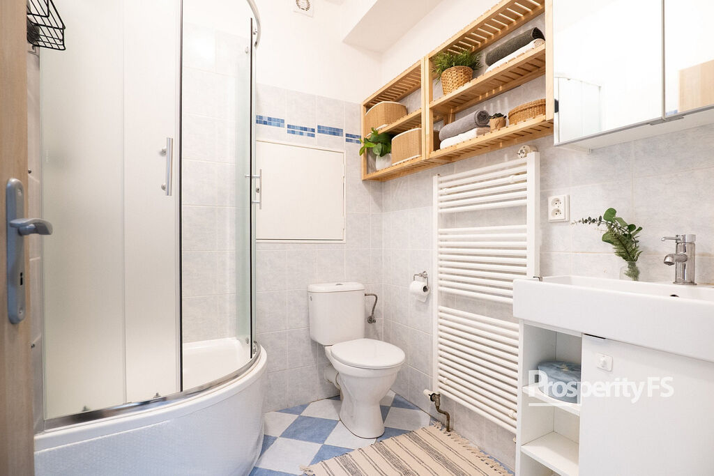 ● Vybavení: byt se bude prodávat nevybavený, zůstane vestavěná skříň na chodbě, kombinovaná elektrická trouba se sporákem, zrcadlová skříňka nad umyvadlem a skříňka pod umyvadlem, nově instalovaný sprchový kout, zatmavovací rolety na oknech