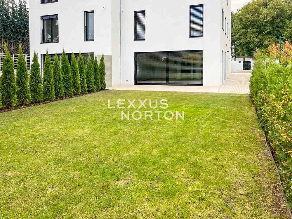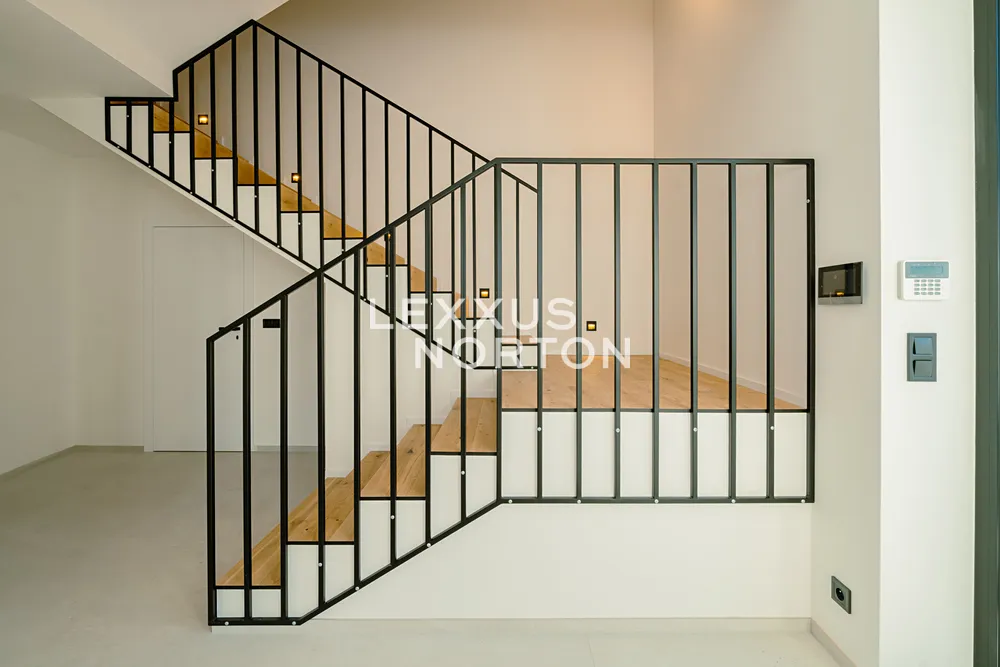 Tento prostorný dům k pronájmu zahrnuje vstupní chodbu, obývací pokoj s přímým vstupem na zahradu (410 m2) s terasou (26 m2) a kuchyňským koutem (foto ilustrační). V 1. patře se nachází chodba, 1 ložnice se šatnou a koupelnou, další koupelna a 2 ložnice. Ve 2. patře domu naleznete chodbu, 1 ložnici s balkónem (17 m2), koupelnu, další 2 ložnice, technickou místnost a prádelnu. Do pater vede dřevěné, osvětlené schodiště. V přízemí se také nachází samostatná toaleta. K bytu náleží dvě garážová stání s elektro nabíječkou pro automobil, dvě venkovní parkovací stání na pozemku před domem a automatická sekačka.
