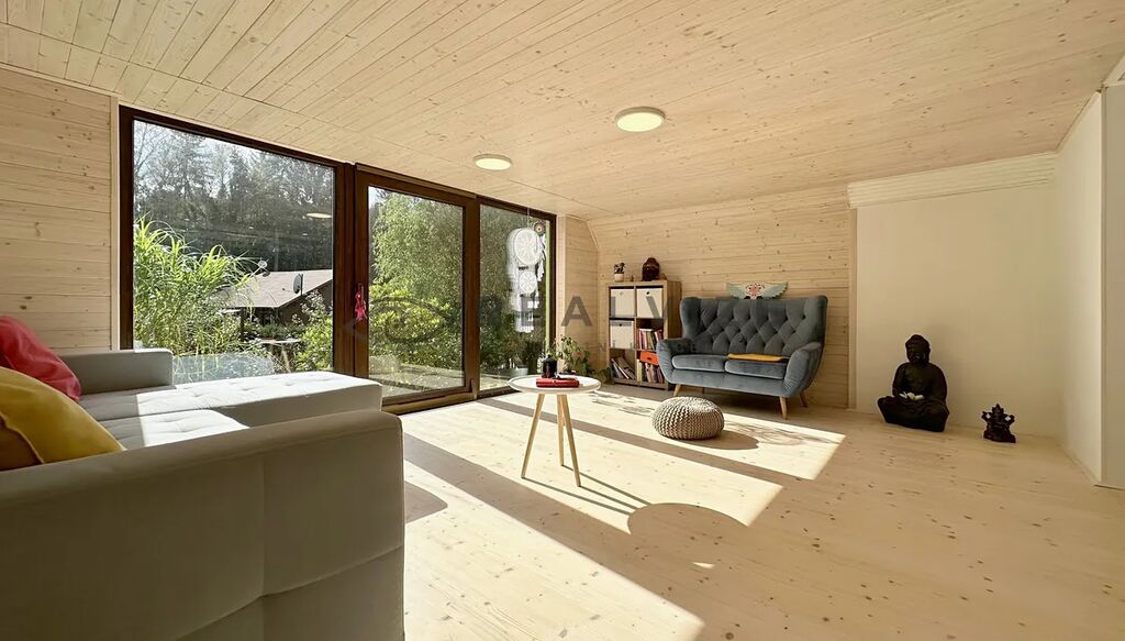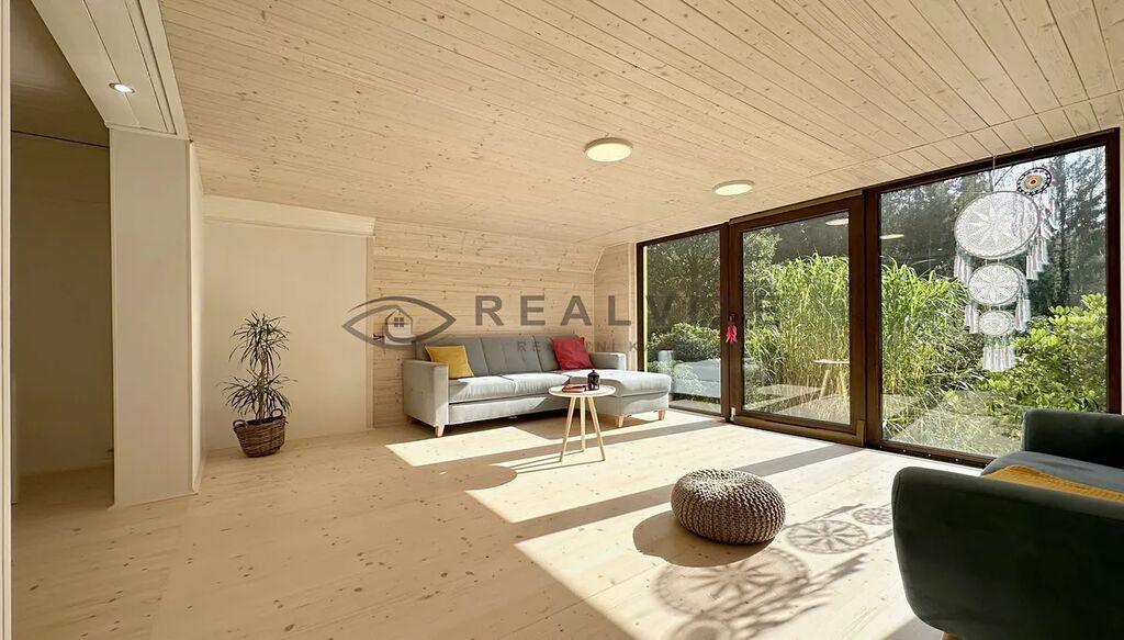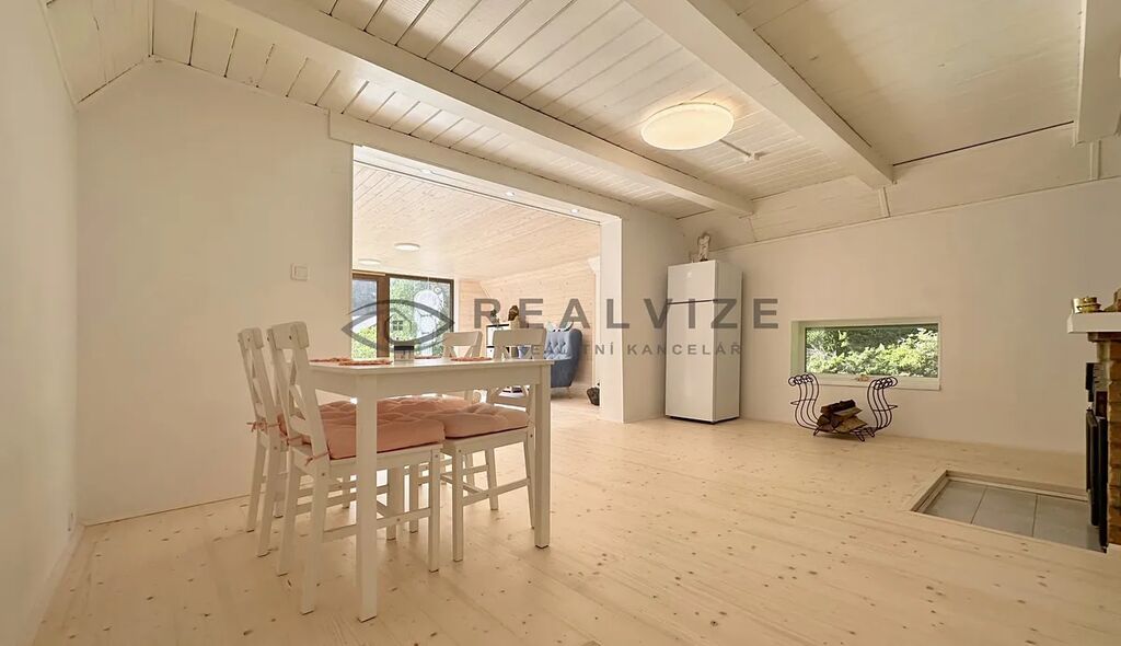 Také nově zvětšil původní prostor a tím získal prostorný obývací pokoj a jižní stranu chaty osadil velkými okny, díky kterým je přízemí chaty nádherně prosluněné.