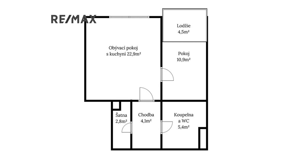 Dispozice bytu nabízí prostorný obývací pokoj s kuchyňským koutem (22,9 m²), ložnici (10,9 m²), chodbu (4,1 m²), koupelnu s WC (5,4 m²) a šatnu (2,8 m²). K bytu náleží lodžie (4,5 m²) s dostatkem místa na posezení. Orientační půdorys naleznete ve fotogalerii.