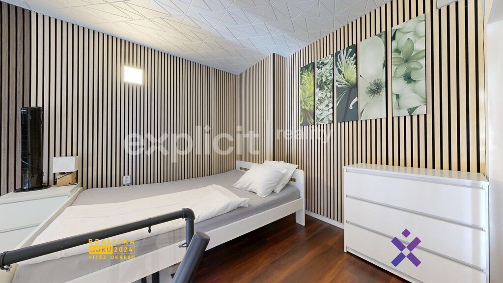 Horní patro loftu nabízí prostor pro odpočinek. Najdete zde postel, noční stolek a komodu.