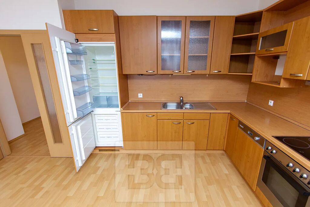 Prostorný obývací pokoj s kuchyňským koutem má jihozápadní orientaci, je tu vstup na balkon. Kuchyňský kout má spoustu úložného prostorů, je plně vybaven spotřebiči: sklokeramickou varnou deskou, digestoří, horkovzdušnou troubou, myčkou a lednicí. Všechny spotřebiče jsou ve velmi dobrém stavu.