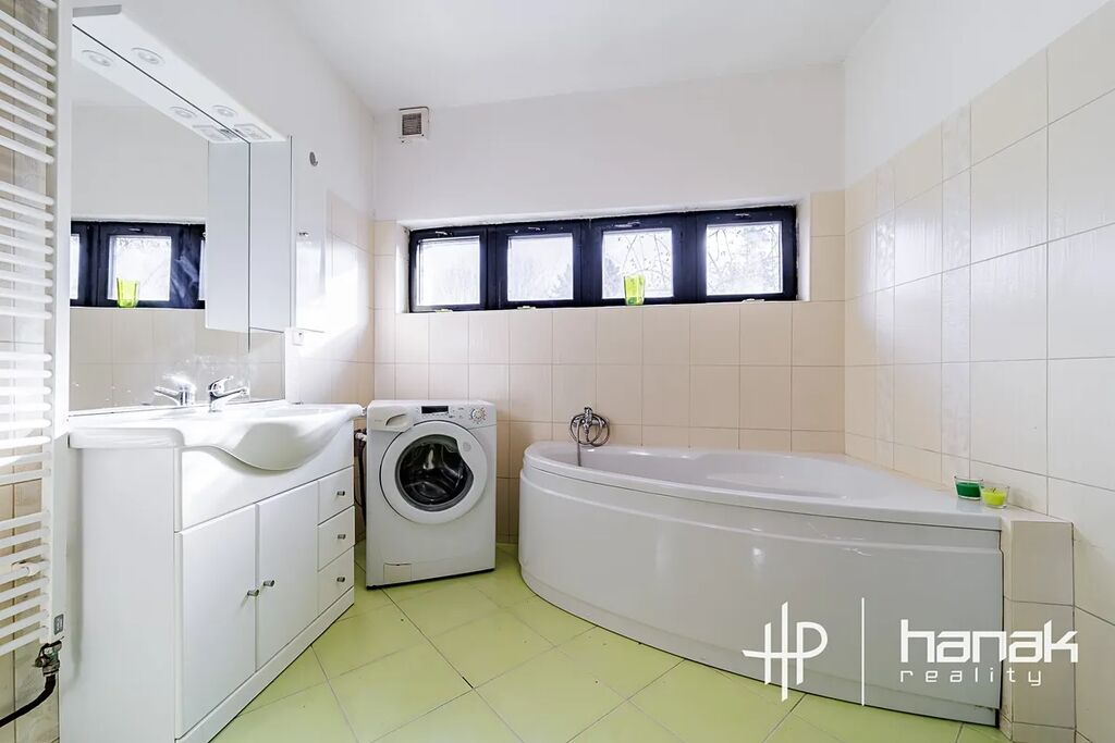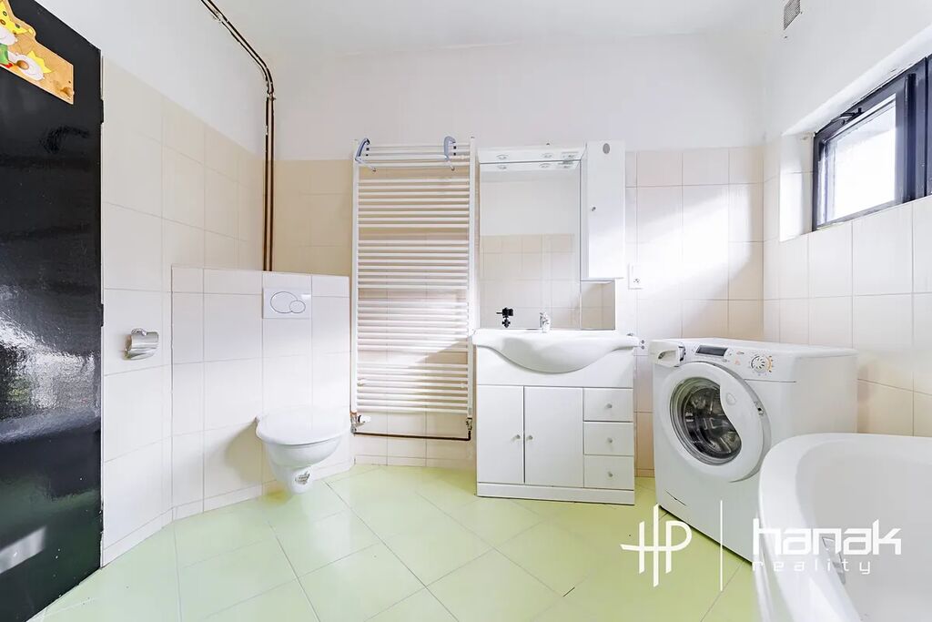Koupelna je vybavena vanou, sprchovým koutem, toaletou, umyvadlem a prostorem pro pračku.