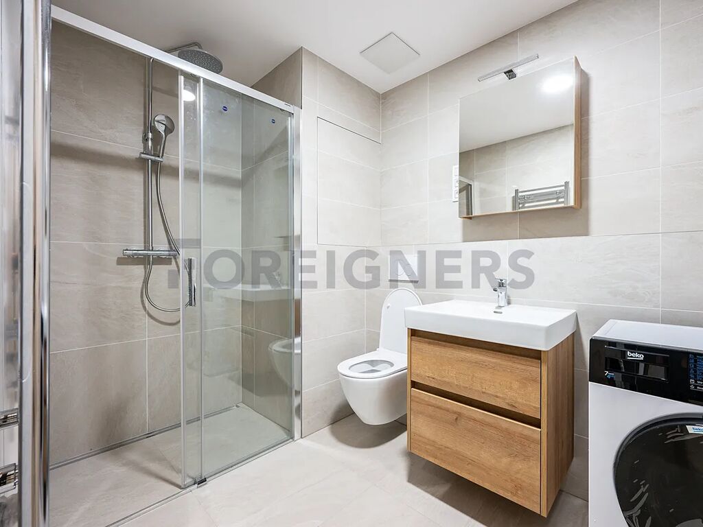Koupelna kombinuje sprchový kout s toaletou, nechybí zde pračka se sušičkou a topný žebřík. Pokoj je vybaven klimatizací a podlahovým topením, které zajišťuje komfort po celý rok. Podlahy tvoří kombinace vinylu a keramické dlažby, okna jsou plastová a doplněná elektrickými žaluziemi.
