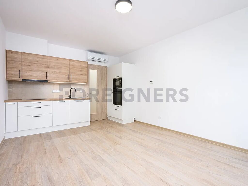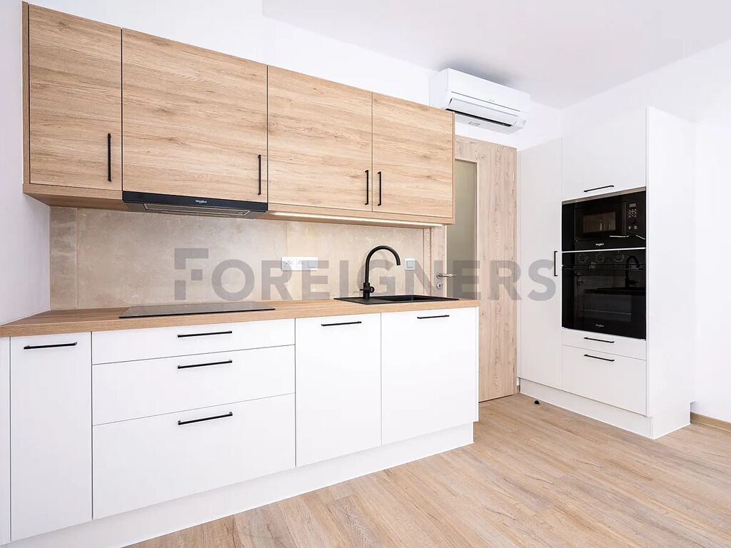 Byt je částečně zařízený a nabízí moderní vybavení pro pohodlné bydlení. Kuchyň je vybavena vestavěnými spotřebiči – troubou, myčkou a mikrovlnnou troubou, lednice je volně stojící.