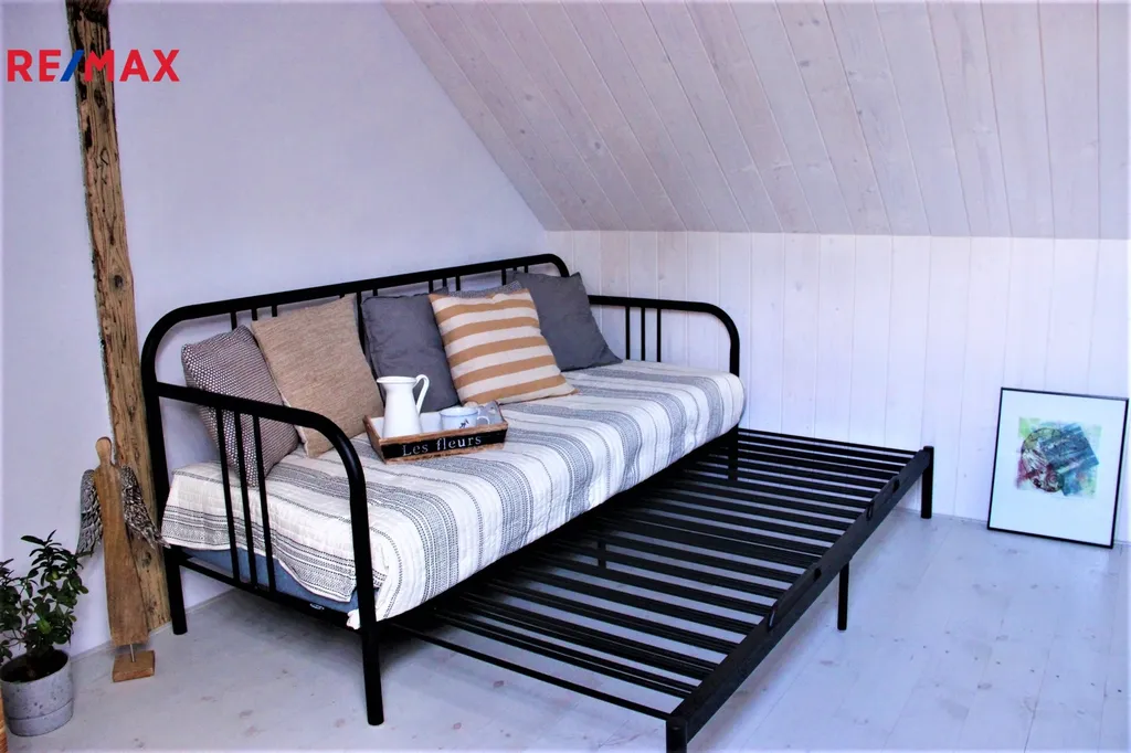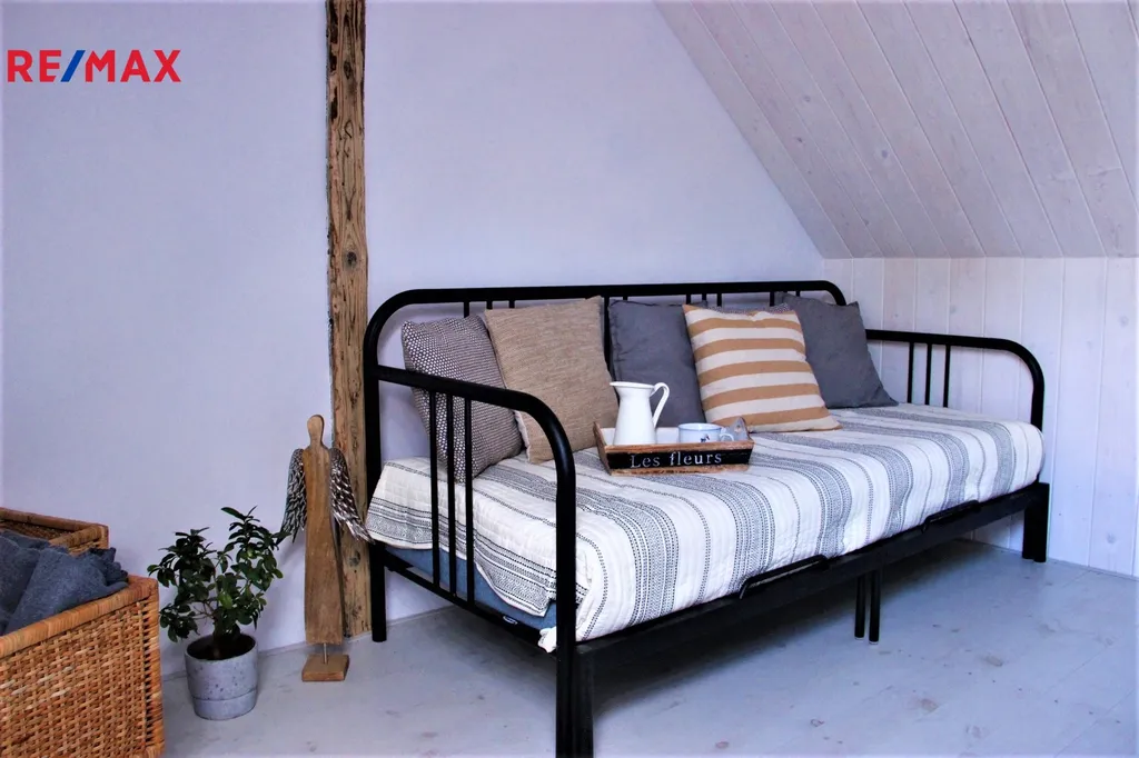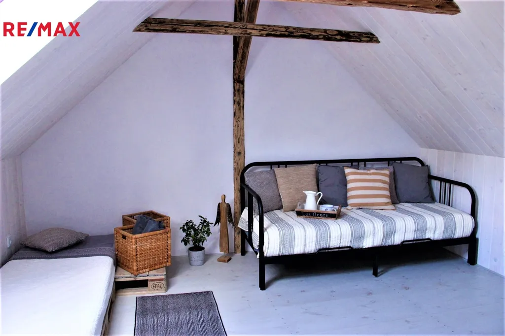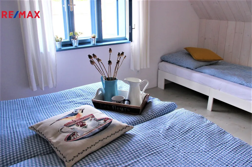 V přízemí domu se nachází otevřený obytný prostor, který spojuje styl a útulnost. Dominantou interiéru jsou krbová kamna, u nichž si můžete vychutnat teplo i atmosféru praskajícího ohně. Prostor dále doplňuje jídelní stůl pro šest osob, pohodlná rozkládací sedačka a plně vybavená kuchyň. Součástí přízemí je také koupelna se sprchovým koutem a toaletou. Točitými schody se vystupuje do prvního patra, kde jsou situovány dvě neprůchozí ložnice, každá s kapacitou až tří osob. Celý dům je příjemně vyhříván podlahovým topením a krbovými kamny, což zajišťuje plný komfort i v chladnějších měsících. Za domem se rozprostírá malá zahrádka s posezením a možností grilování, ideální pro odpočinek a letní večery.