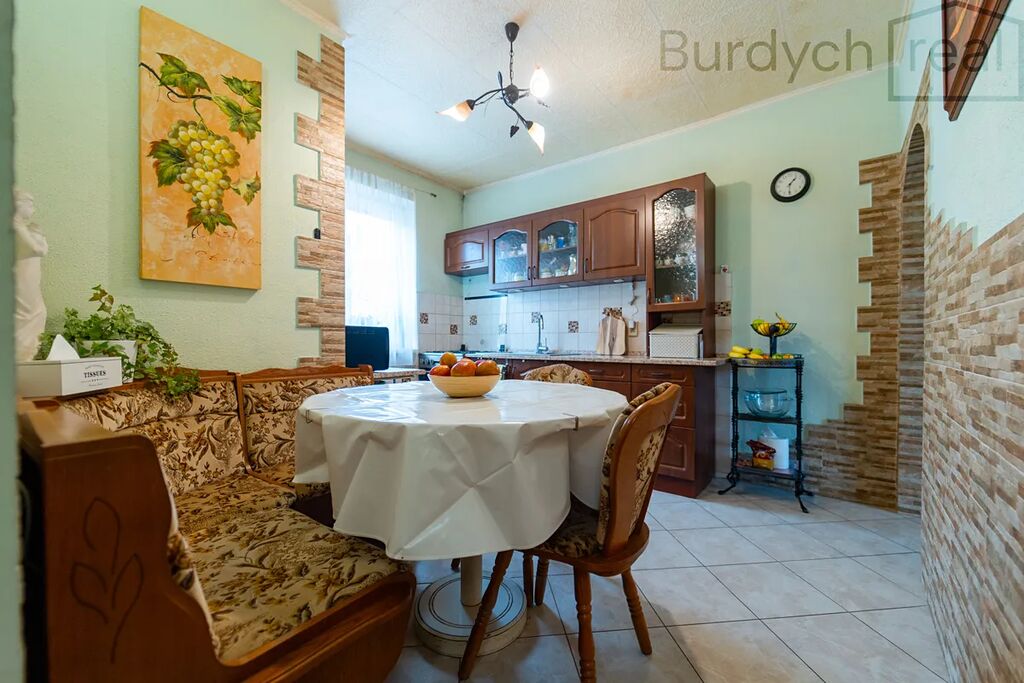 Dům 6+1, který může být váš, nabízí 131m2 obytné plochy. Má 2 patra, kuchyni, koupelnu, 4 ložnice a prostorný obývák, ve kterém v zimě praská oheň v krbu. A samozřejmě i sklep a pohodlný vjezd na pozemek.